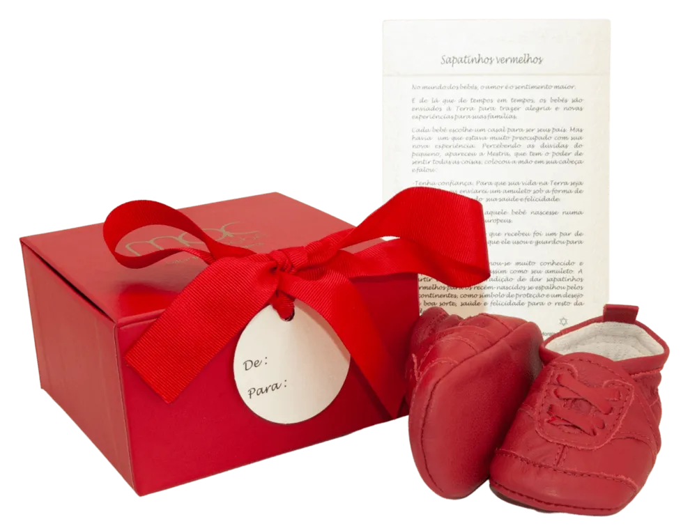 A Lenda: No mundo dos bebês,o amor é o sentimento maior. É de lá que de tempos em tempos,os bebês são enviados a terra para trazer alegria e novas experiências para suas famílias. Cada bebê escolhe um casal para ser seus pais. Mas havia um que estava muito preocupado com sua nova experiência. Percebendo as dúvidas do pequeno, apareceu a Mestra, que tem o poder de sentir todas as coisas, colocou a mão em sua cabeça e falou: Tenha confiança. Para que sua vida na Terra seja tranquila,eu enviarei um amuleto sob a forma de presente, garantindo sua saúde e felicidade. _x000D_ Quis o destino que aquele bebê nascesse numa família de ciganos europeus. E o primeiro presente que recebeu foi um par de sapatinhos vermelhos que ele usou e guardou para sempre. O bebê cresceu e tornou-se muito conhecido e respeitado por todos,assim como seu amuleto.A partir de então,a tradição de dar sapatinhos vermelhos para recém-nascidos se espalhou pelos 5 continentes,como símbolo de proteção e um desejo de boa sorte, saúde e felicidade para o resto da vida. _x000D_ _x000D_ A Mac Bebê resgata a lenda do sapatinho vermelho, em parceria com o autor, para proporcionar as mamães e seus bebês toda a magia que é o nascimento de um bebê, através de uma sapatilha para bebê, feito a mão em couro genuíno de alta maciez e qualidade. Use sapatilha de couro em seu bebê, o couro respira e o pezinho vai ficar sempre sequinho e seguro. Receba seu kit contendo uma linda caixa de presente contendo o sapatinho vermelho, um cartão com a lenda impressa em cartão especial perolado e em alto relevo e um tag de: /para: